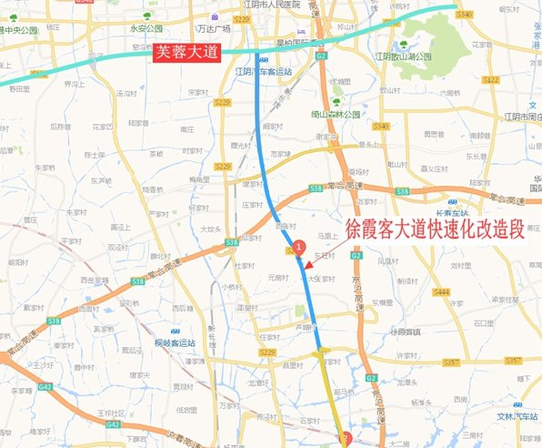 徐霞客大道快速化(一期)工程项目,与无锡凤翔快速路相连,总投资约10.5亿元。一期工程主线改造5个节点,分别为江阴大道、峭张路、沪武高速、闵普路和青霞路。