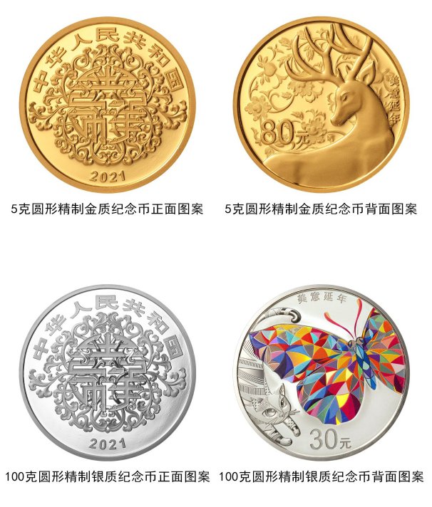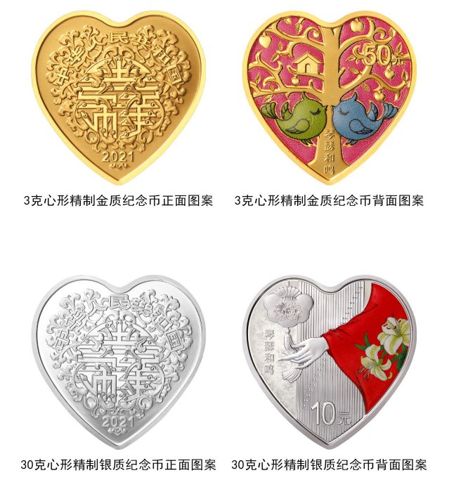 本次发行吉祥文化金银纪念币包含四个主题:“琴瑟和鸣”(心形纪念币)、“寸草春晖”、“美意延年”、“竹报平安”
