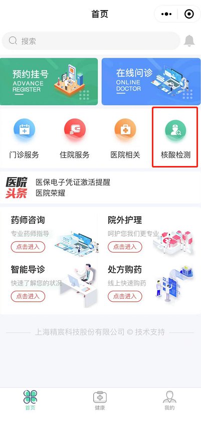 ①点击首页“核酸检测”功能按钮,进入核酸检测页面后选择“核酸检测门诊”,市民可酌情自行选择时间。