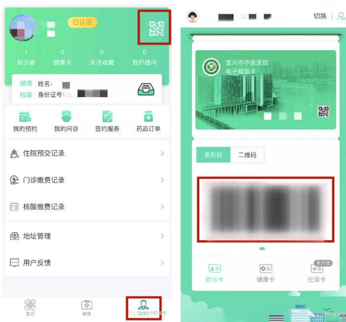 ④完成门诊缴费后,前往小程序首页“我的”——点击右上角二维码,保存条形码页面,采样时出示条形码。