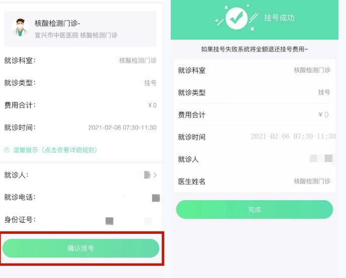 ②进入挂号确认界面点击“确认挂号”,核酸检测免挂号费。