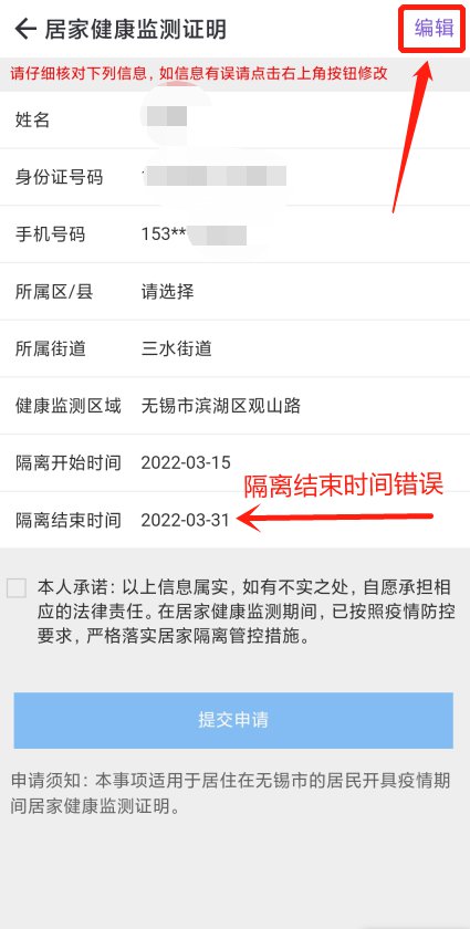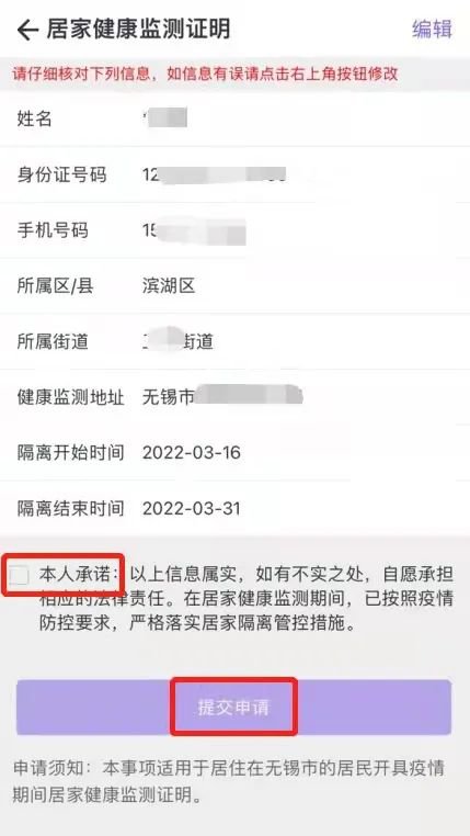(四)如信息核对有误,请点击页面右上角“编辑”进行修改,提交后耐心等待后台审核。审核结果将以短信和APP消息推送的形式通知申请人,审核通过后完成信息核对即可领取“居家健康监测证明”。