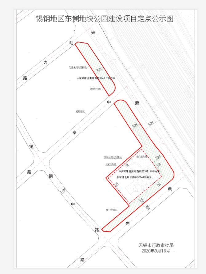 2020年9月17日,行政审批局公示,锡钢地区东侧地块公园来了,总可建设用地面积约30244㎡