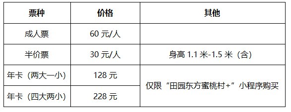 2、年卡价格调整:两大一小年卡价格由原98元调整至128元,四大两小年卡价格由原188元调整至228元,取消实体年卡,游客可通过“田园东方蜜桃村+”小程序购买,已售年卡有效期内仍照常使用。