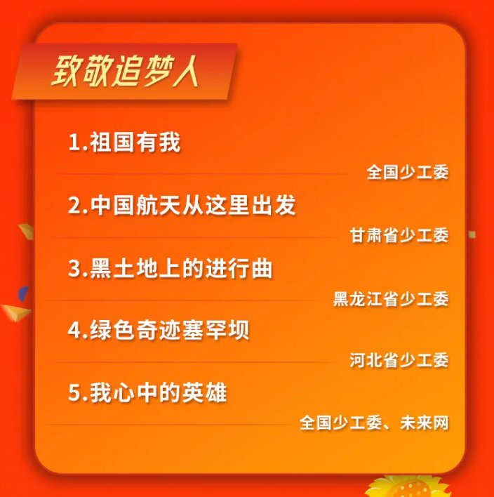 ➤内容简介:云队课围绕“请党放心,强国有我”主题,分“致敬追梦人”、“奋斗正当时”、“一起向未来”3个篇章,充分展现新中国以来伟大成就取得背后的艰辛和奉献,展现各行各业奋斗者的感动故事,展现新时代少先队员立志成长的风采风貌。