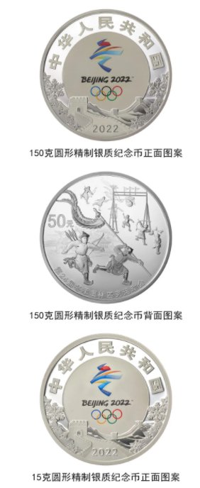 150克圆形银质纪念币背面图案为清代《冰嬉图》元素组合设计,并刊“第24届冬季奥林匹克运动会”字样及面额。