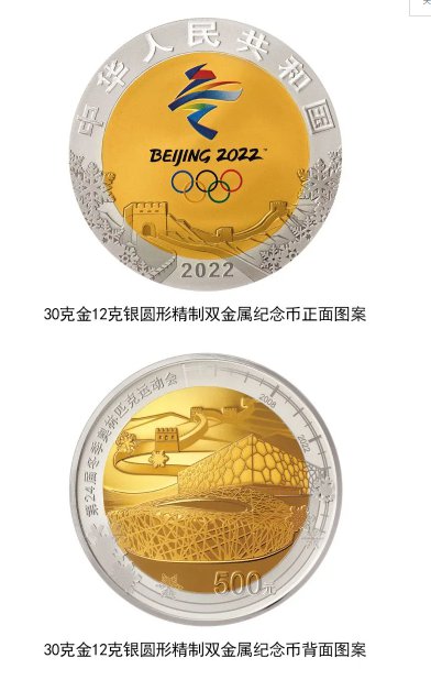 30克金12克银圆形双金属纪念币背面图案为国家体育场、国家游泳中心场馆造型,衬以长城、雪花等装饰组合设计,并刊“第24届冬季奥林匹克运动会”字样及面额。