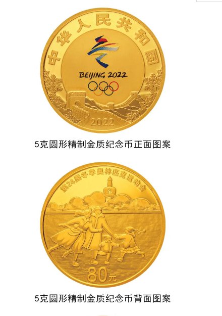 5克圆形金质纪念币背面图案为张家口蔚县剪纸风格滑雪造型,衬以柿子、窗棂等组合设计,并刊“第24届冬季奥林匹克运动会”字样及面额。