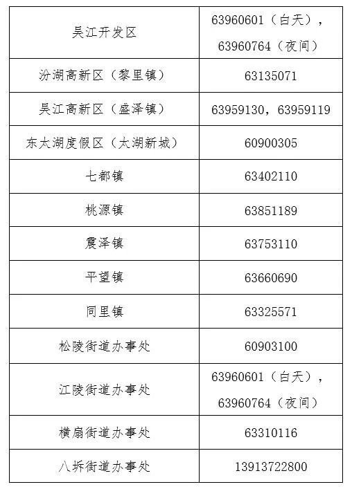 吴江区各区镇(街道)新型冠状病毒感染的肺炎疫情防控工作专班值班电话: