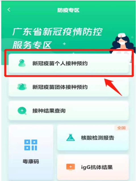 三、进入广东省新冠疫情防控服务专区,点击“新冠疫苗个人接种预约”。
