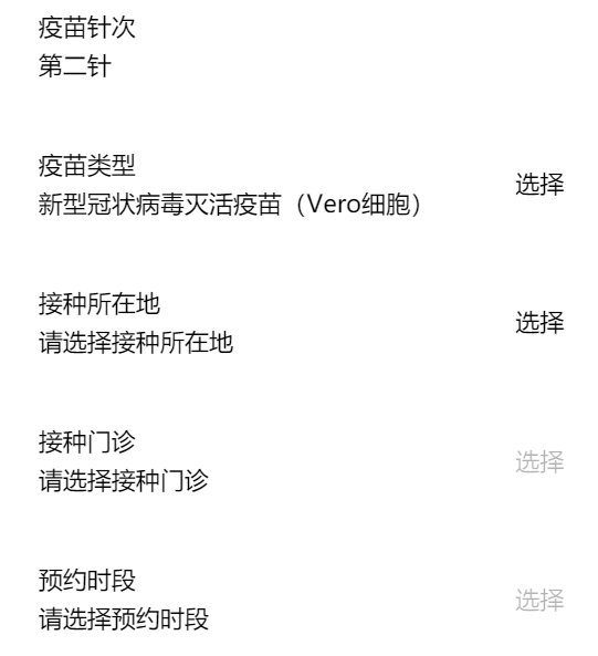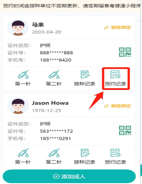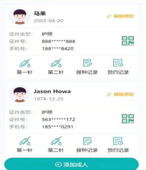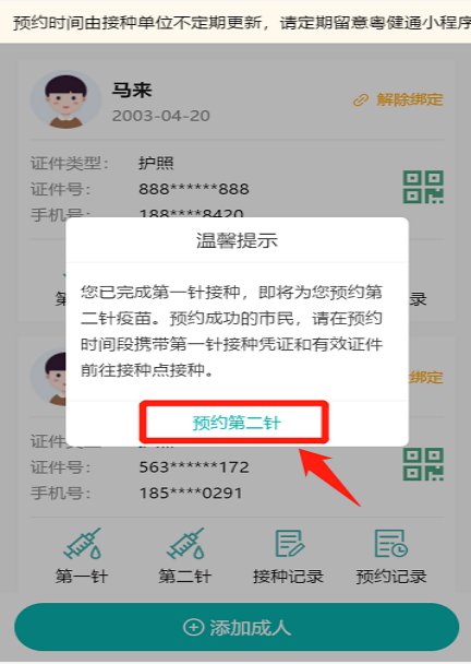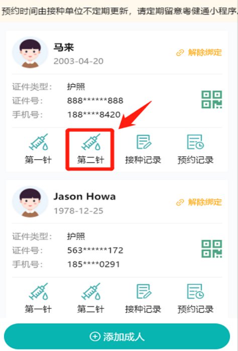 五、找到需要预约第二针疫苗的成人,点击下方的“第二针”,即可开始预约信息填报。