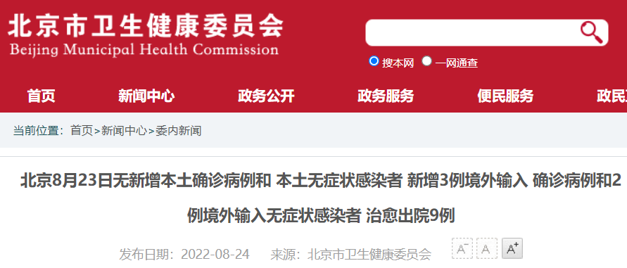 8月23日0时至24时,无新增本土确诊病例、疑似病例和无症状感染者;新增3例境外输入确诊病例和2例无症状感染者,无新增疑似病例。治愈出院9例,解除医学观察的无症状感染者4例。