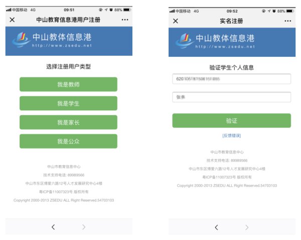 ③:选择注册用户类型,如学生、教师、家长选择不同的类型进行注册。填入用户个人信息:身份证号码及姓名,点击【验证】按钮