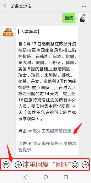 温馨提示:微信搜索公众号“无锡本地宝”,在聊天框回复“回国”,查询海外回国政策;回复“锡康码”,即可进入锡康码申报入口,查询申报流程;回复“口罩”查询口罩预约购买入口,查询最新消息等!