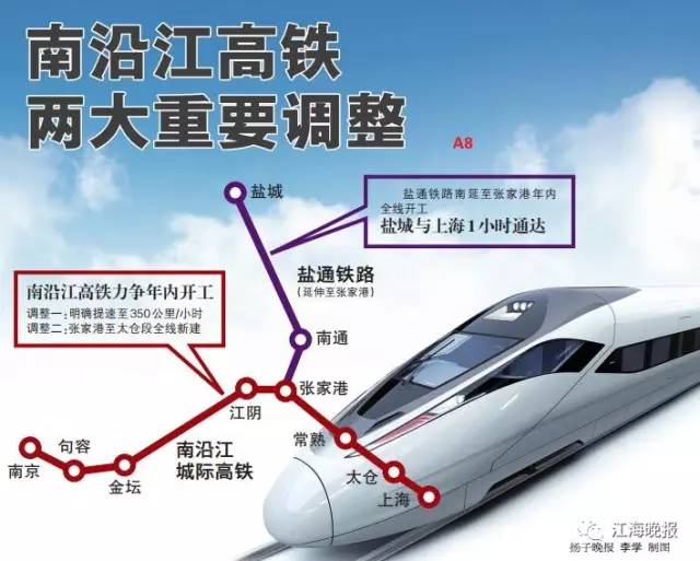 年年初,据江苏省铁路办透露,去年底设计时速提升至350公里/小时的盐通铁路将南延至张家港,从而提早打通江苏沿海至上海的高速通道。