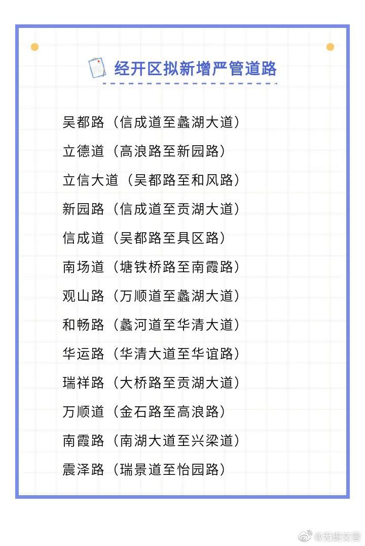 为了进一步优化道路交通环境,提高道路通行效率,保障道路交通有序、安全、畅通,交警部门拟对经开区新增以下严管道路,违停者将处以100元罚款记3分的处罚。