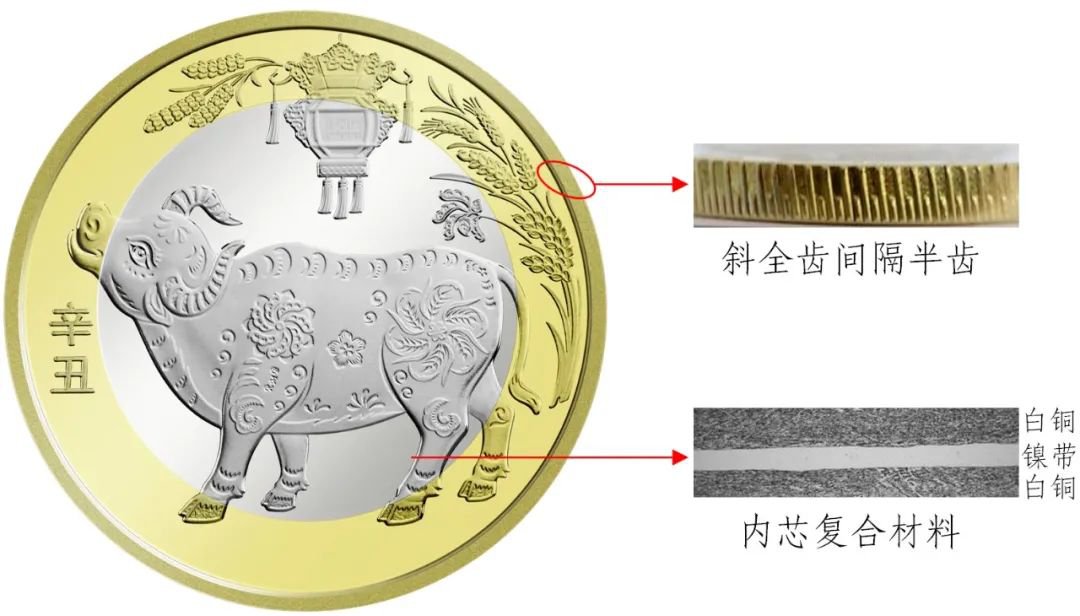 硬币外环为黄铜合金,内芯为具有独特机读性能的镍带复合白铜材料。