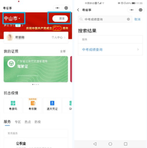 在“粤省事”小程序搜索框输入“中考成绩查询”。(注意:地区必须选择“中山市”)