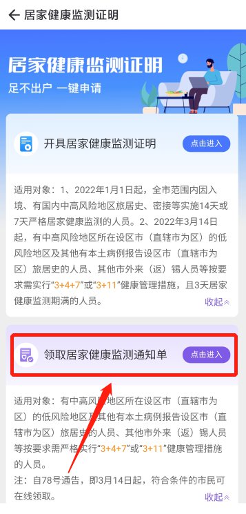 3.点击 “领取居家健康监测通知单”进入领取页面。