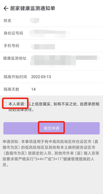 2.申请人应按照无锡市疫情防控第78号通告的要求严格落实居家健康监测,并配合防疫工作人员做好核酸采样等工作。