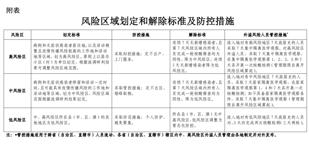 3.解除标准。连续7天无新增感染者,且第7天风险区域内所有人员完成一轮核酸筛查均为阴性,降为中风险区;连续3天无新增感染者降为低风险区。