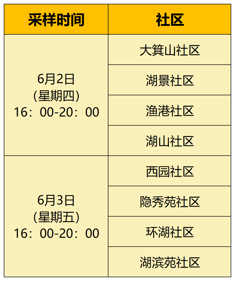 为科学精准有效做好疫情防控工作,全面排查疫情风险,切实保障人民群众生命安全和身体健康。根据区指统一部署,蠡园开发区(蠡园街道)新冠肺炎疫情联防联控指挥部研究决定,在6月2日(星期四)16:00-20:00,6月3日(星期五)16:00-20:00开展区域核酸检测。现将有关事项公告如下: