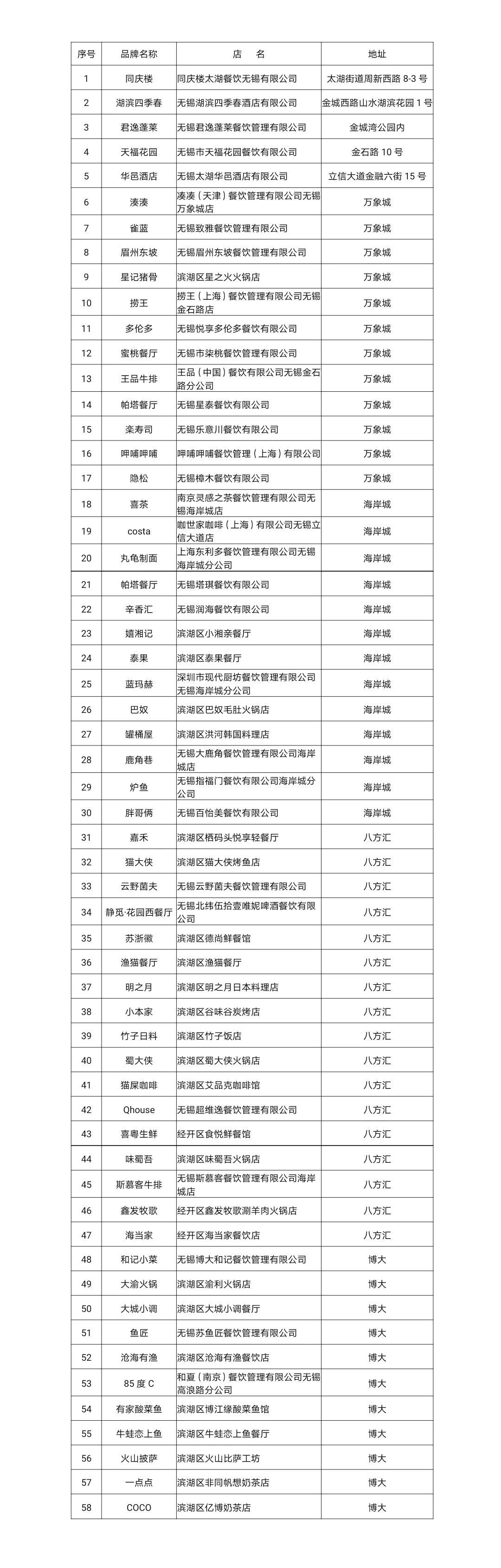 无锡经济开发区餐饮企业复工名单