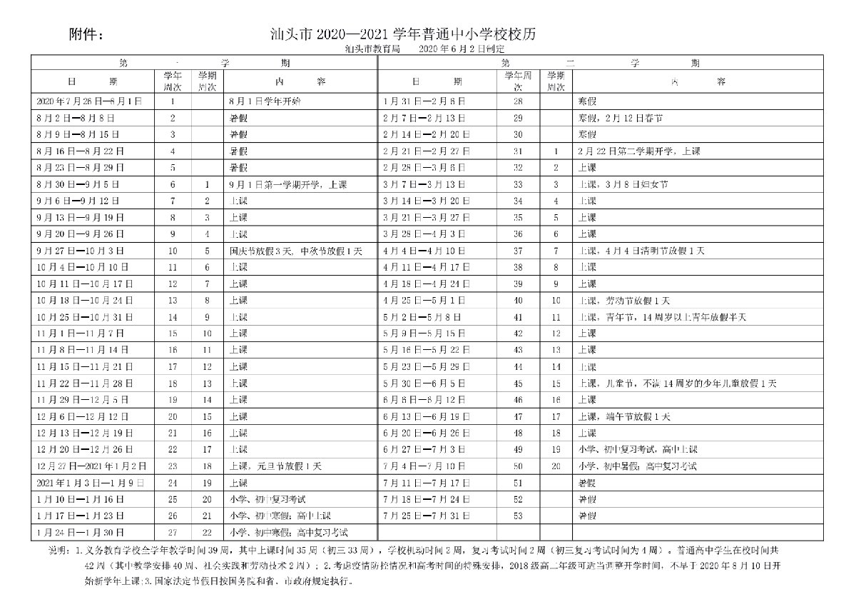 根据《汕头市2020—2021学年普通中小学校校历》安排:2020年8月30日至9月5日为第一学期第1周,开学时间为9月1日。