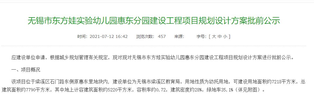 无锡市东方娃实验幼儿园惠东分园建设工程项目规划设计方案批前公示
