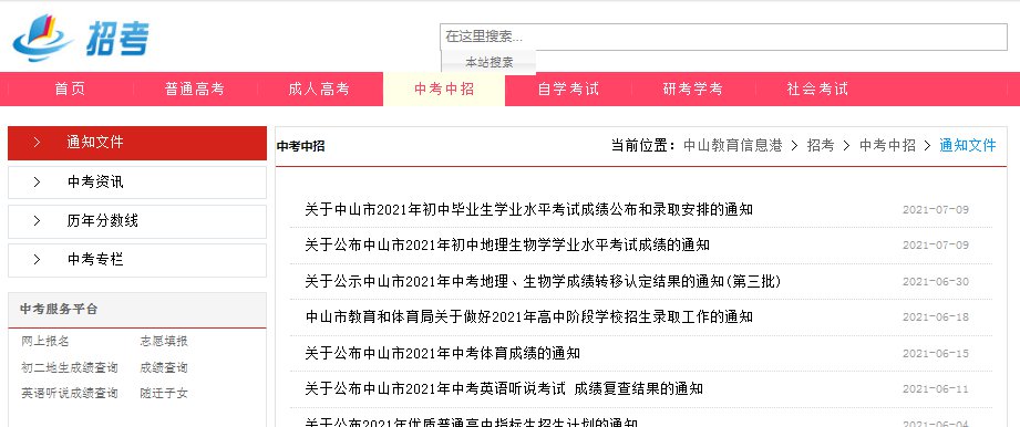 2021中山中考成绩查询网站入口