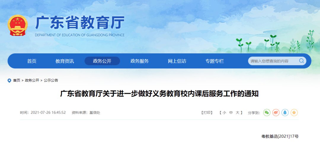 2021年7月,广东省教育厅发布了,《关于进一步做好义务教育校内课后服务工作的通知》