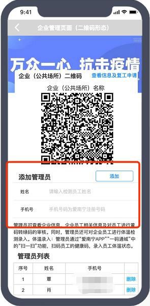 1、在爱广西APP健康码页面下方进入“企业管理入口”,点击“添加管理员”,输入需要添加的管理员姓名及其注册手机号,点击“添加”完成管理员添加。管理员可查看企业基本信息和员工健康数据,同时可审批员工的转码申请。
