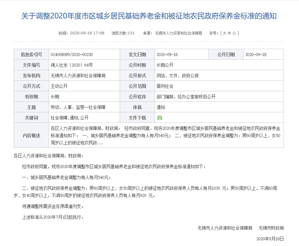 《关于调整2020年度市区城乡居民基础养老金和被征地农民政府保养金标准的通知》