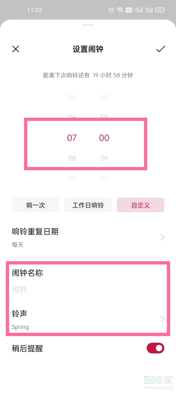 3、设置好闹钟时间和铃声,将【稍后提醒】开关开启,点击右上角的勾即可。