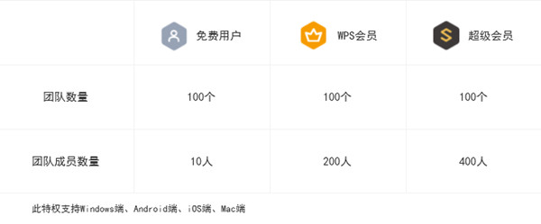 wps超级会员可以创建400人的共享团队,wps会员可以创建200人的共享团队,免费用户可以创建10人的共享团队,但都可以创建100个团队。