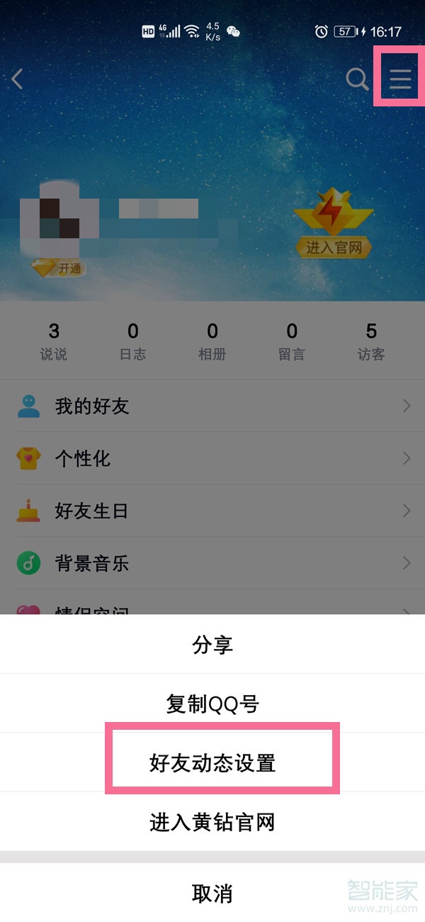 2、点击个人头像进入主页,点击右上角三横,选择【好友动态设置】。