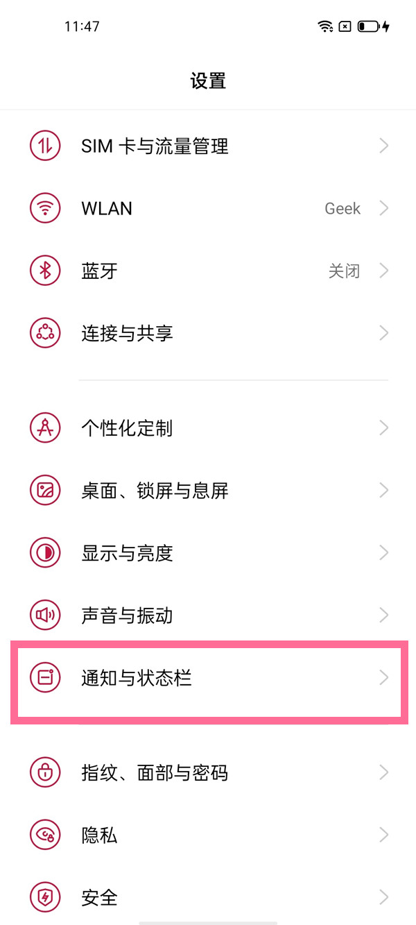 1、在手机设置菜单中点击【通知与状态栏】。