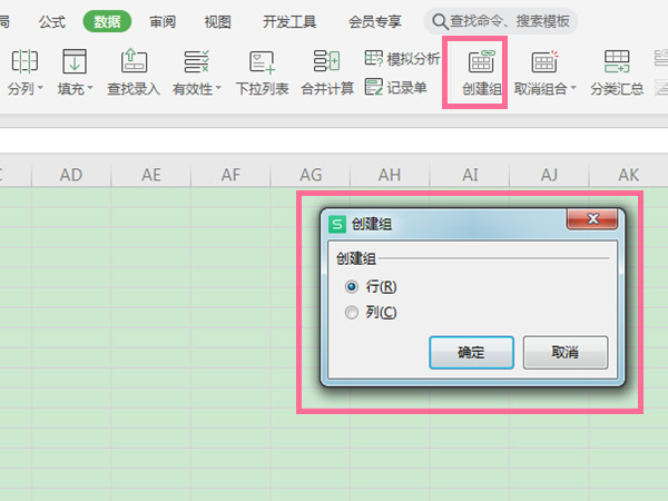 2、在数据中,点击创建组选项,选择行进行组合。