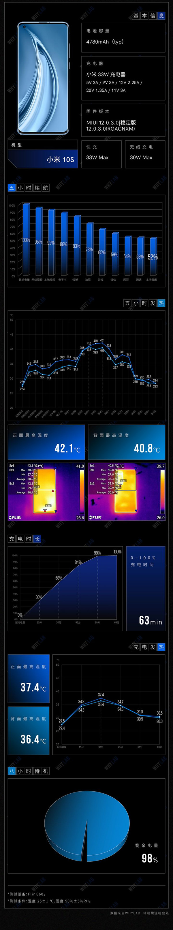 充电速度上,实测 15 分钟充电 30%,完全充满共用时 63 分钟;充电期间最高温在 36°C-37.5°C 上下,温升表现优秀;5 小时续航测试中,小米 10S 剩余 52% 电量,4780mAh 大电池继承了小米 10 优秀的续航表现;测试过程中,小米 10S 背部最高温度 40.8°C,其最热处出现在了拍照环节,发热点也位于摄像头附近,正面最高温度 42.1°C,出现在游戏环节;8 小时待机测试剩余 98% 电量。