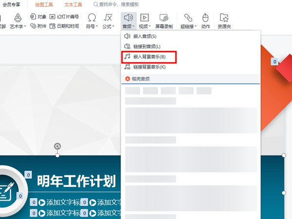 2、点击【嵌入背景音乐】,添加音乐即可。