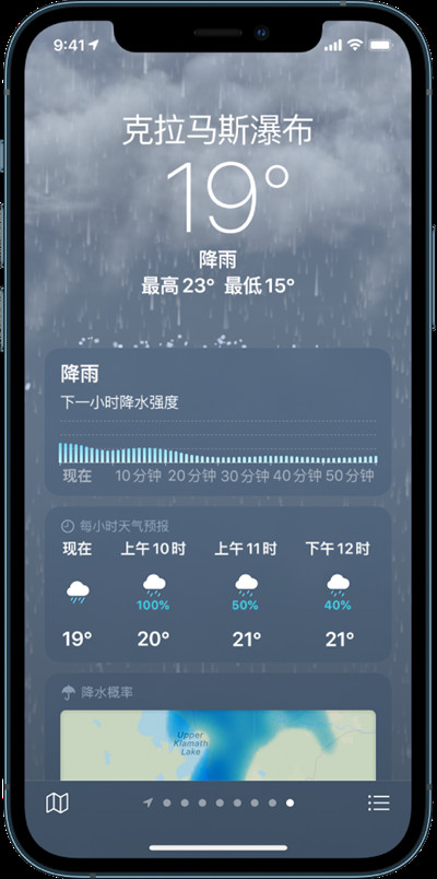 iphone天气百分比不是雨量,是指降雨概率,在降水地图缩小可以查看12小时的降水预报,放大以查看下一小时的降水预报。