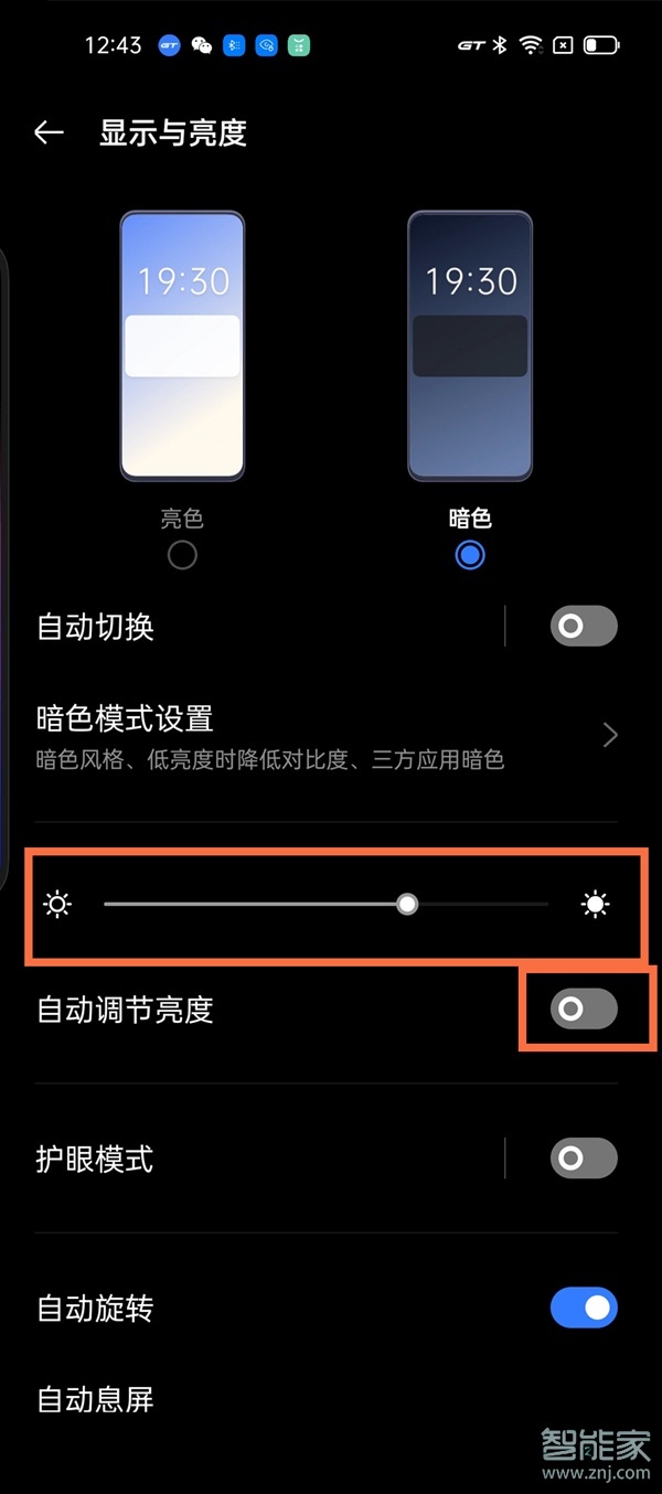 3、在亮度图标中滑动即可调节,也可以开启自动调节亮度。