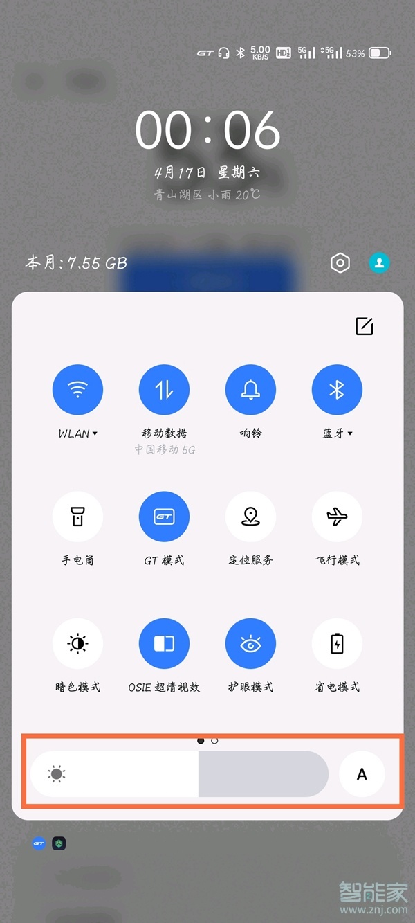 1、从屏幕顶部拉出状态栏,在亮度图标中往左边滑动调暗,往右边滑动调亮。
