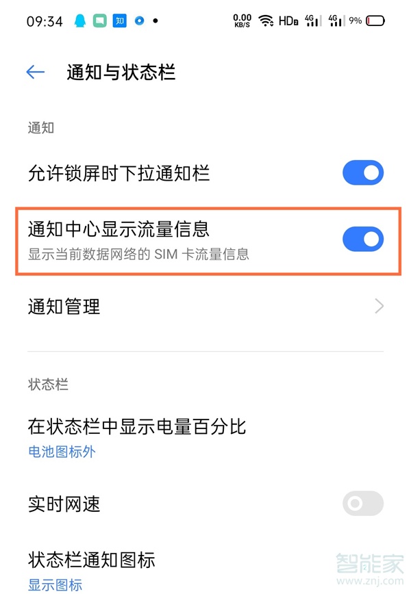 2、进入通知与状态栏页面后,将【通知中心显示流量信息】。