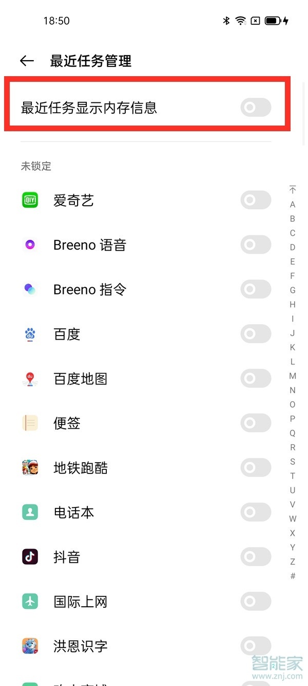 3、将【最近任务显示内存信息】右侧的开关开启即可。