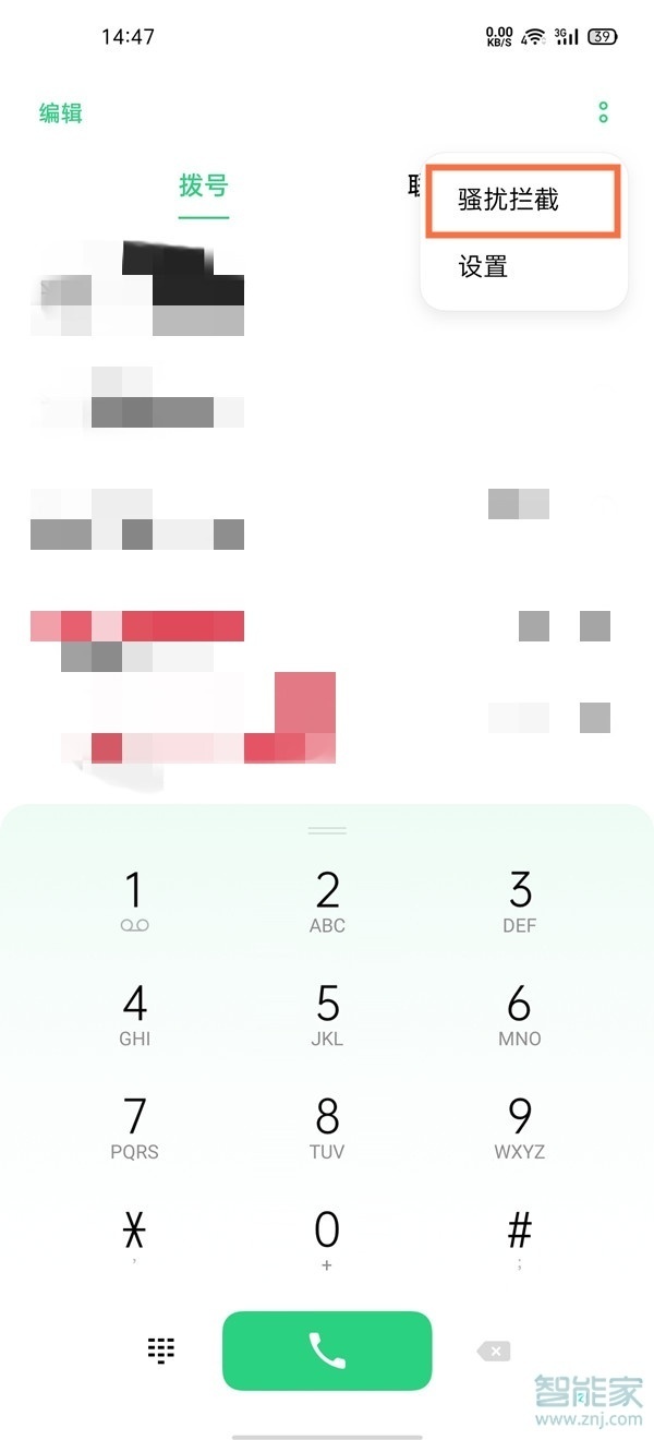 1、打开手机桌面上的拨号图标,点击右上角的两点,选择【骚扰拦截】。