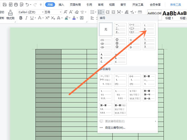 4、将鼠标引动到一列表格的上面显示出黑色的箭头,单击鼠标左键选中一列表格,再选择编号即可。