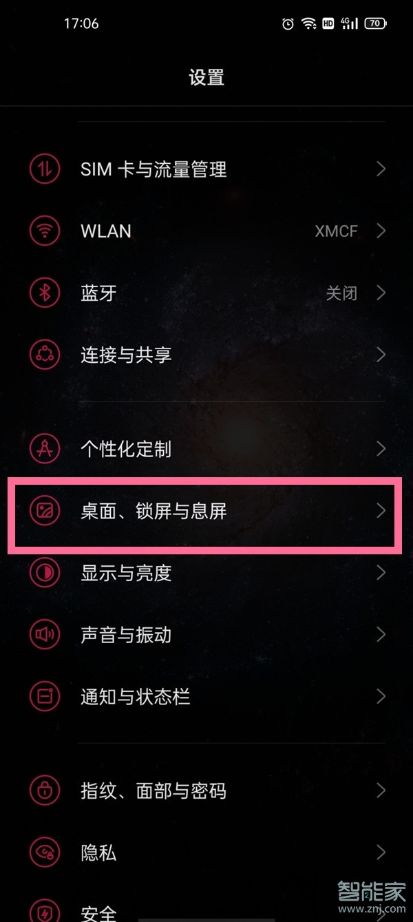 1、打开手机设置选项,点击【桌面、锁屏与息屏】选项。