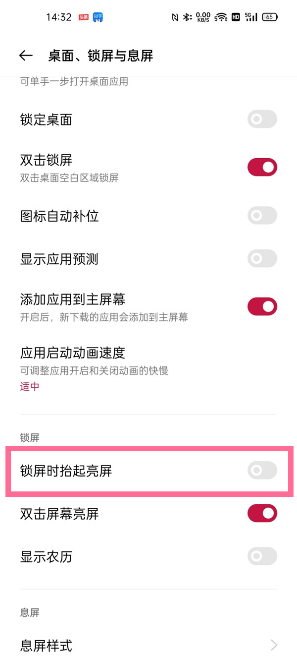 2、进入桌面、锁屏与息屏设置页面后,将【锁屏时抬起亮屏】的开关开启即可。